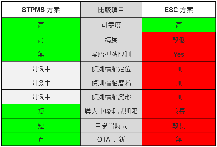 - STPMS方案除了精度高外並且可以偵測輪胎其它狀態,明顯優於ESC方案。