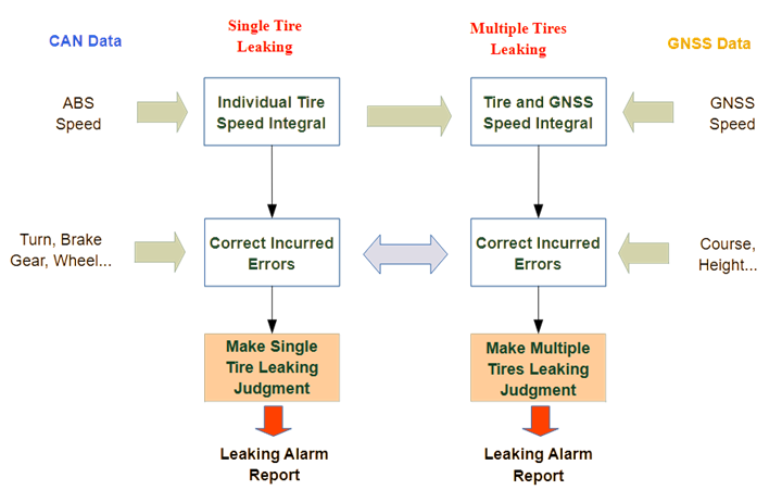 - 其中ABS的數據為車輪轉速,當輪胎漏氣時車輪轉速變快,STPMS演算法可偵測出此一狀態,當欠壓大於國標值時即發出報警。
