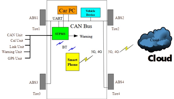 - STPMS讀取車輛的CAN數據(主要是ABS)及GNSS數據做運算,監測胎壓狀況。