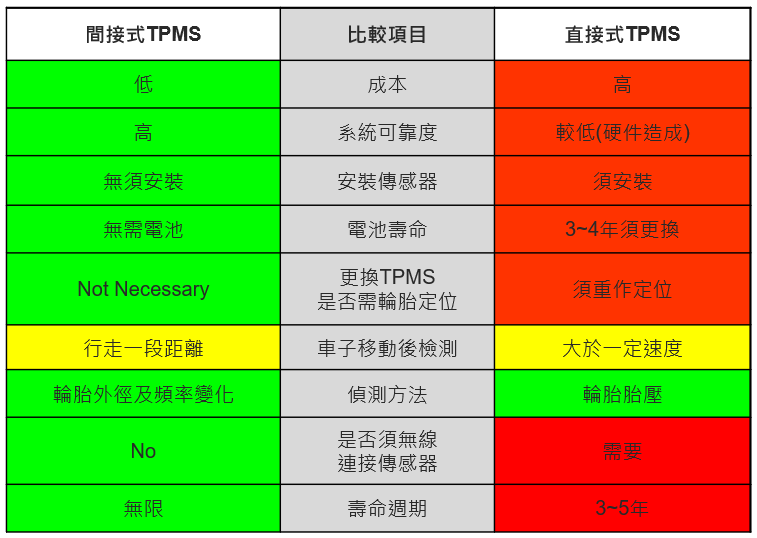- 直接式TPMS直接量胎壓,偵測精度較高,間接式TPMS的算法監測胎壓,精度較低。